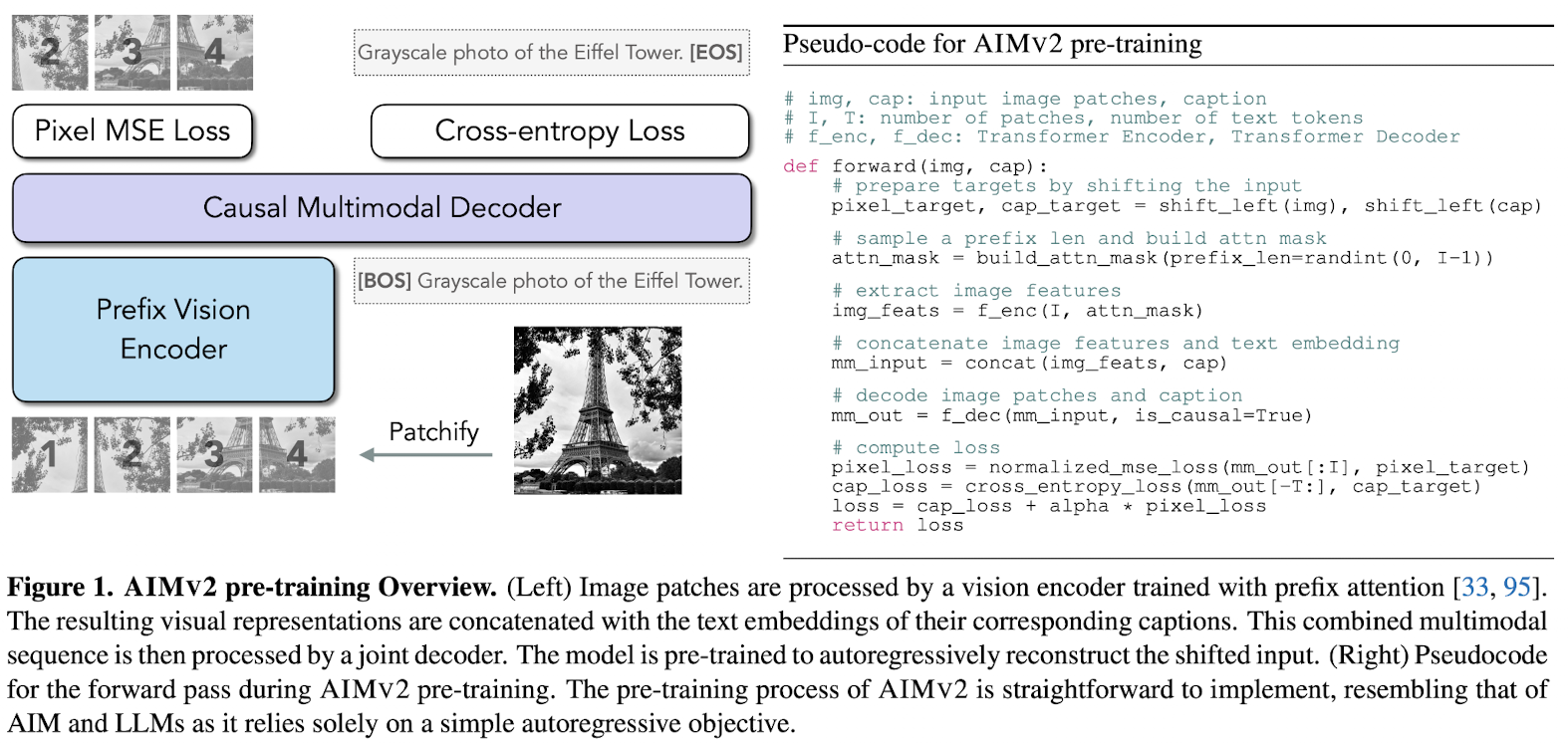 AIMv2 is a family of open vision models pretrained to autoregressively generate both image patches and text tokens. During pretraining, AIMv2 uses a causal multimodal decoder that first regresses image patches and then decodes text tokens in an autoregressive manner.