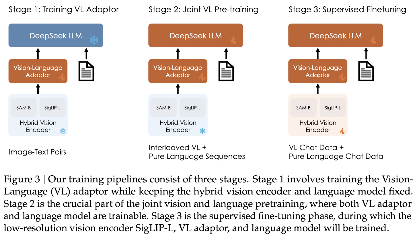 The hybrid vision encoder combines the SAM-B and SigLIP-L encoders 结合了高分辨率的 SAM-B 编码器与低分辨率的 SigLIP-L 编码器,以在固定的 token 预算内既保留细节信息,又提取丰富的语义特征。