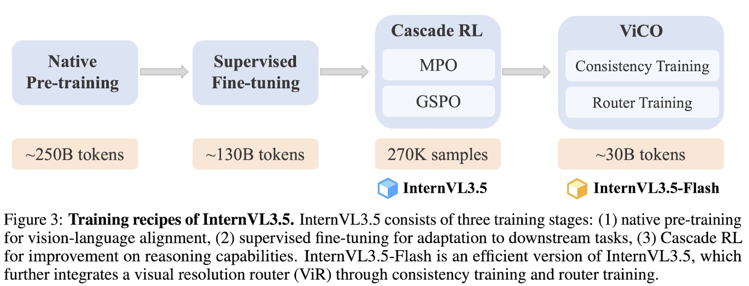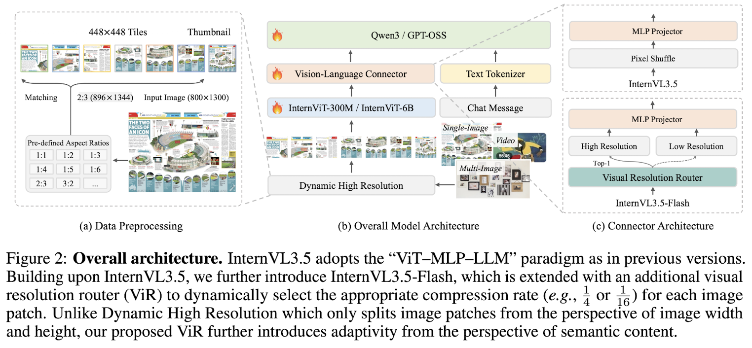 - Visual Consistency Learning(ViCO): aims to integrate visual resolution router(ViR) into InternVL3.5 to construct Flash model, by minimizing the output divergence of different visual compression rates