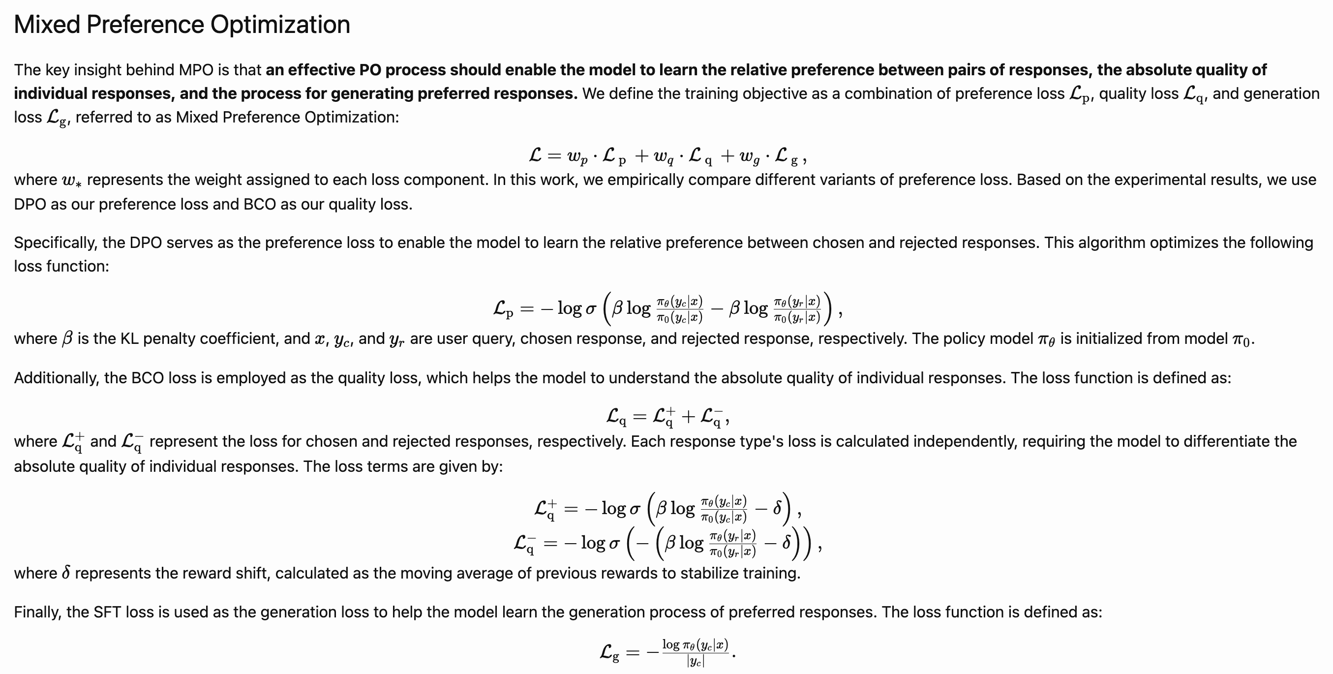 Offline RL Stage Employ mixed preference optimization(MPO) to finetune the model. The training objective of MPO combines