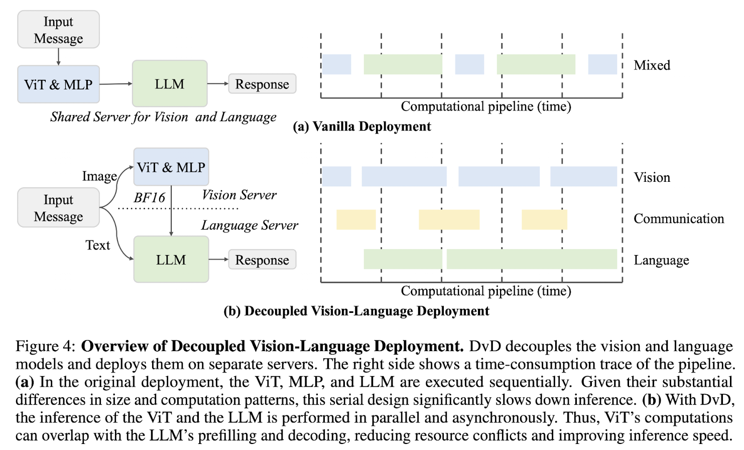 Decoupled Vision-Language Deployment(DVD) DVD separates vision and language processing, with a particular focus on optimizing the pre-filling stage.