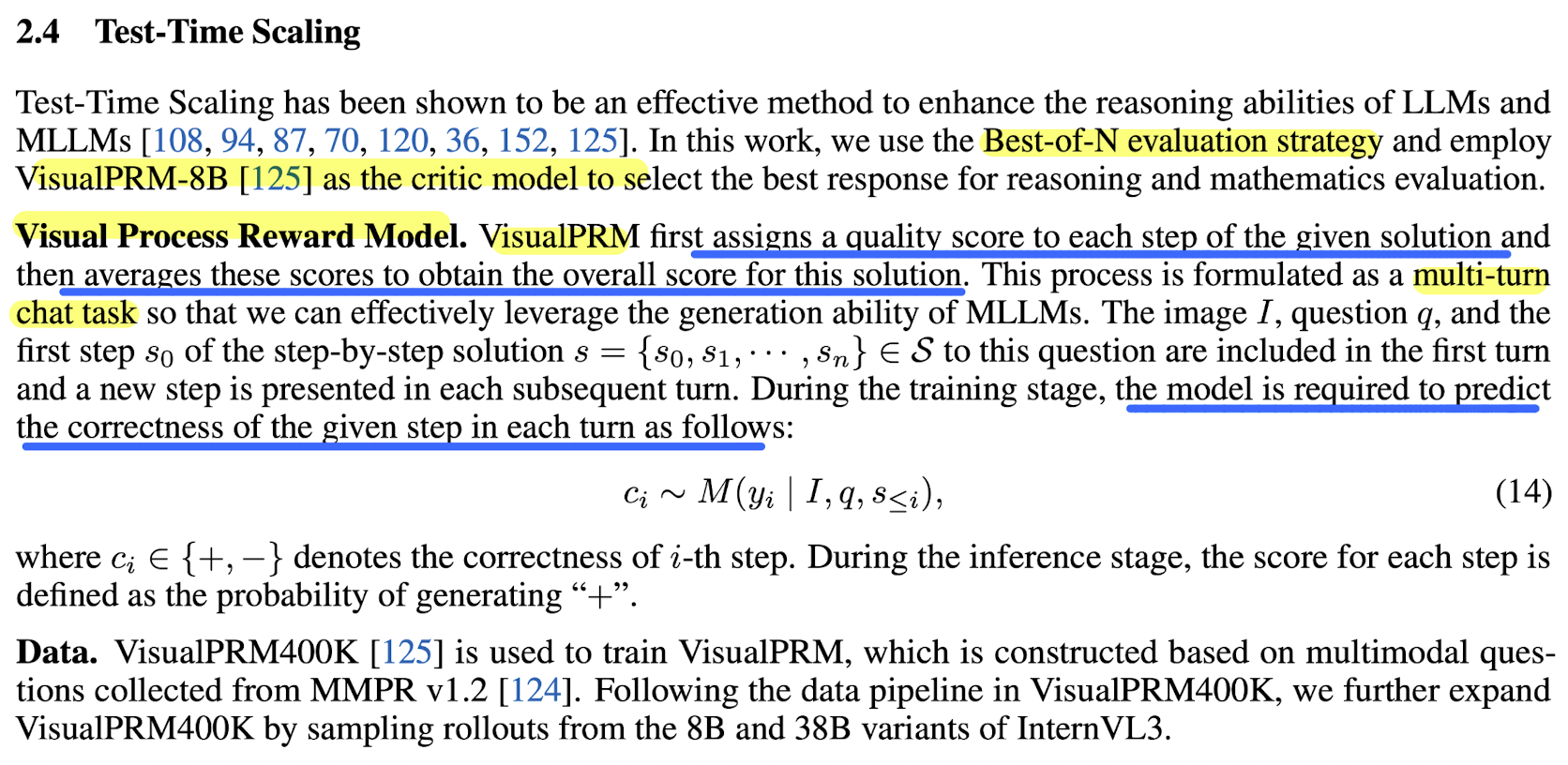 Deep Thinking Guide the model to deliberately engage in step-by-step reasoning. Parallel Thinking Adopt the Best-of-N(BON) strategy by employing VisualPRM-v1.1 as the critic model to select the optimal response from multiple reasoning candidates.